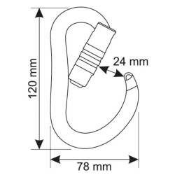 Mousqueton HMS extrêmement robuste avec arrêt automatique nécessitant trois actions (soulever, tourner et appuyer) pour ouvrir le doigt.